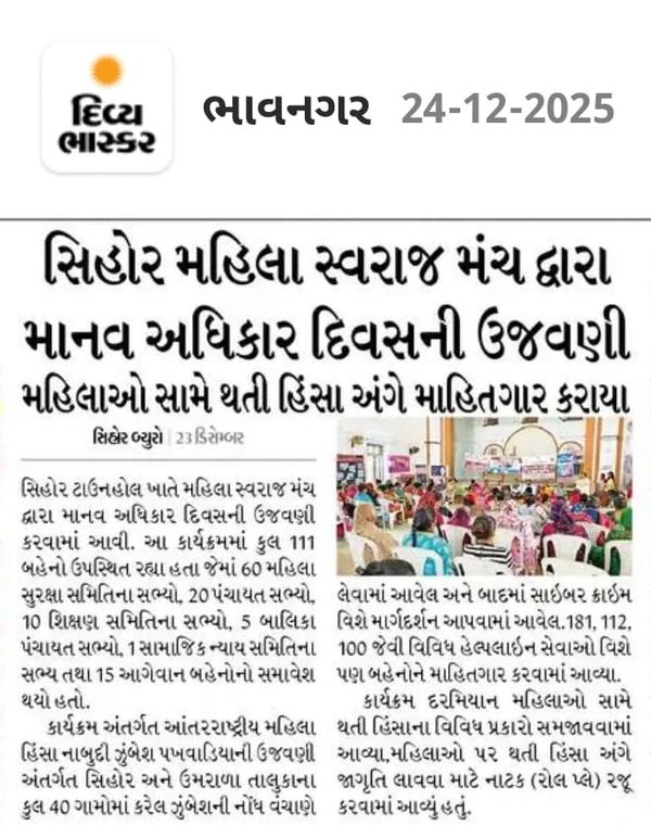 On December 22, 2025, the Mahila Swaraj Manch organized a celebration of Human Rights Day at the Sihor Town Hall. The event was attended by several dignitaries, including P.S.I. Shri N. K. Makwana of the Sihor Police Department; Sanjaybhai, Ajaybhai, and their team from the District Women and Child Development Department; Ashutoshbhai and Vijaybhai from the Bhavnagar Cyber Crime Cell; Social Security Officer Hetalben; Priyanka-ben, Counselor for the 181 Abhayam Women's Helpline; Kanizben, Coordinator of the Sakhi One Stop Center; Raiyaben Rathod, President of Mahila Swaraj Manch; Savitaben Rathod, former President; Secretary Familaben; and the entire Mahila Swaraj Manch team.